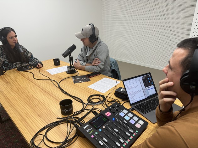 Sara Zozaia musikaria, Gorka Erostarbe MurMur saioaren gidaria eta Ander Mujika sintoniaren egilea eta musika teknikaria, lehen grabazioan. LARA MADINABEITIA